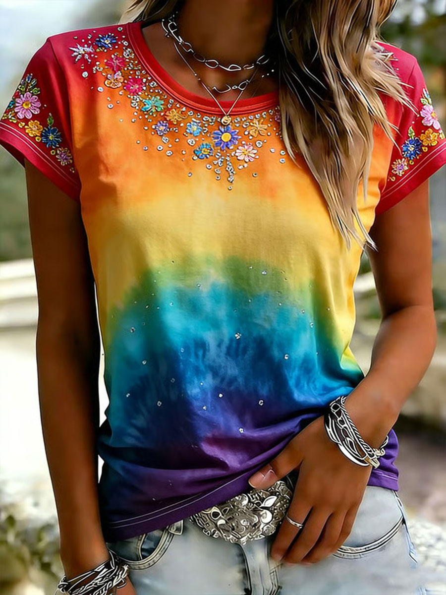 Women's Rainbow Floral Print Casual T-shirt